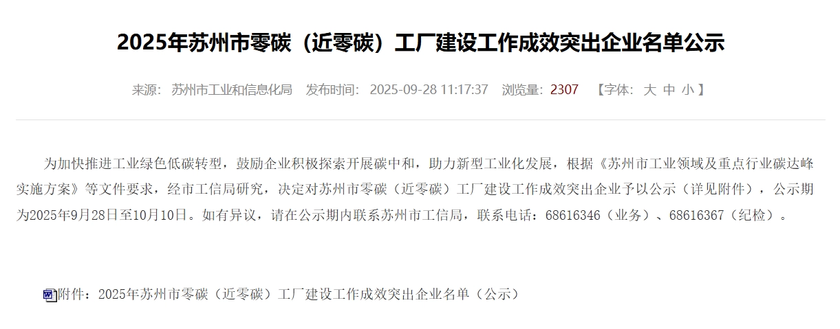 Com o objetivo de implementar a estratégia nacional de "neutralidade de carbono" e acelerar a transformação verde e de baixo carbono do setor industrial, incentivar as empresas a explorar e implementar ativamente a neutralidade de carbono e apoiar o desenvolvimento da nova industrialização, a cidade de Suzhou divulgou recentemente a "Lista de Empresas com Conquistas Notáveis na Construção de Fábricas de Carbono Zero (ou Quase Zero) em 2025".